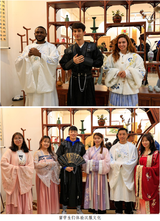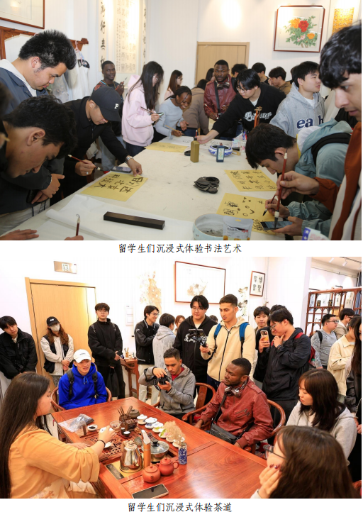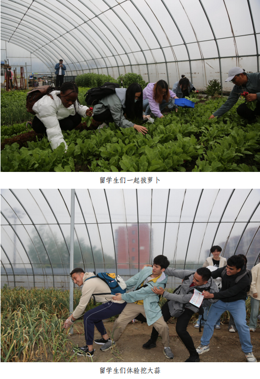 座谈会后,留学生参观无人系统应用研究中心,感受中国科技的飞速发展。在劳动实践教育活动中,留学生们亲手制作爆米花,到蔬菜大棚内进行拔萝卜、挖大蒜等劳动实践,体验中国田园生活的乐趣。在传统文化体验馆,留学生们试穿汉服,沉浸式体验茶道与书法,感受中国茶文化的宁静和谐,在我院学生的帮助下书写汉字,领略书法艺术的魅力。