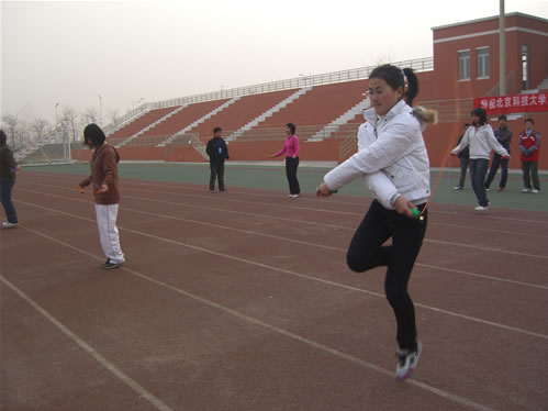 12月8日下午举行跳绳比赛,跳绳比赛由集体跳绳、双人跳绳、担任跳绳组成。集体跳绳比赛材料系以五分钟276个的成绩获第一名,管理系、经济系获二、三名;双人跳绳比赛管理系冯彬、黄歆哲获得第一名,成绩两分钟164个,管理系郭艳丽、熊锋铭获得第二名,材料系陈瑞、郑海峡获得第三名;单人跳绳比赛管理系冯彬荣获第一名,成绩每分钟112个,经济系蔺晖、安丽君分获二、三名。