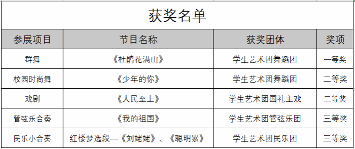近日,由天津市教委主办的2020年天津市学校美育实践课堂——天津市学校文艺展演比赛正式落下了帷幕。我院学生艺术团在本次文艺展演中取得了优异成绩,共荣获一等奖一项、二等奖两项、三等奖两项。其中,学生艺术团舞蹈团群舞节目《杜鹃花满山》荣获大学组一等奖;舞蹈团校园时尚舞蹈节目《少年的你》、国礼主戏戏剧节目《人民至上》荣获大学组二等奖;管弦乐团管弦乐合奏《我的祖国》和民乐团民乐小合奏《刘姥姥》《聪明累》荣获大学组三等奖。