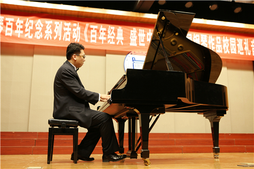 在中国第一首钢琴曲发表百年之际,由天津市音乐家协会、天津交响乐团、天津音乐学院等单位联袂推出的中国钢琴百年纪念系列活动《百年经典 盛世中华》——中国钢琴作品校园巡礼音乐会于12月2日晚6时30分在我院12教学楼艺术系弘艺音乐厅隆重举办。天津市教委体卫艺处副处长刘恒岳,天津市音乐家协会副主席、著名词作家朱胜民,天津交响乐团副团长刘文来,天津青少年活动中心副主任张大庆,天津市教育教学研究室音乐室主任李同全,问鼎国际