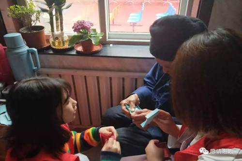 志愿者们怀揣着一颗颗期待与敬重的心,在经过四十分钟的车程后,大家到达了敬老院。在敬老院负责人的带领下,大家三五成群进入老人房间,和老人们聊关于他们的日常生活和曾经发生过的故事,同时志愿者们还教老人如何制作折纸果盘。在敬老院有一位老奶奶今年八十多岁,虽然眼睛看不太清,但在看到志愿者的裤子被磨破了一个洞后,仍坚持着拿针线要为他把破洞缝上,大家无一不被老人的真诚所感动。许多老人听说大家等会要表演,都早早地从房间出来坐在舞台下等着志愿者们演出,大家在表演节目的同时也将我们提前准备好的水果等爱心物品一一送给老人,看着老人们一个个面带着笑容为大家鼓掌的样子,每个人都觉得这段经历是值得的。
