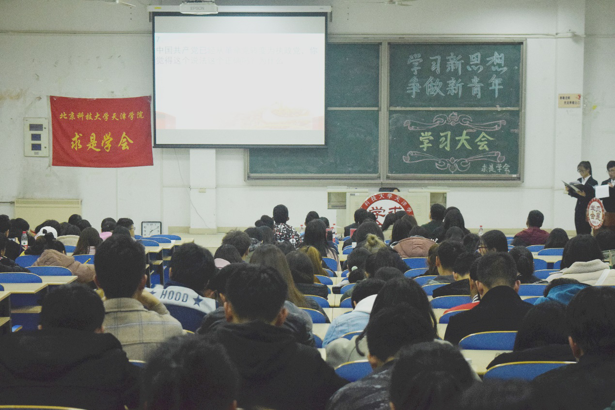 为学习贯彻习近平新时代中国特色社会主义思想,让我院大一新生积极学习新思想,努力做新青年。院求是学会与各院系求是分会联合开展“学习新思想,争做新青年”学习大会活动。本次活动于10月初开始,历经初赛、复赛、决赛三个阶段。由各院系求是分会选出优秀队伍进入决赛。本次决赛于2018年11月15日晚18:30分在九教109正式开展。