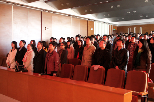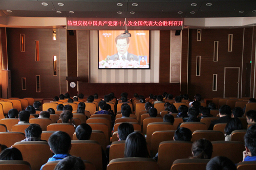 团委组织团委干部及青年学生200余人在学院学术报告厅观看了中国共产党第十八次全国代表大会开幕仪式的现场直播盛况。大会开幕后,全场起立齐唱中华人民共和国国歌,胡锦涛总书记作报告时,大家热切的目光聚焦在投影屏幕上,边听边作着笔记。