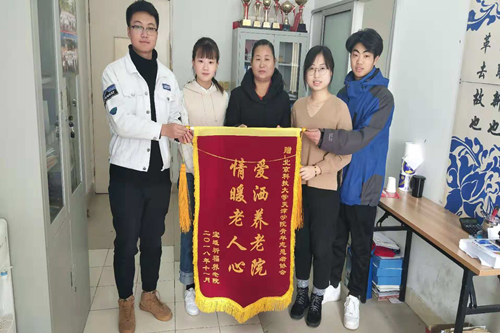 为青年志愿者协会送上锦旗,感谢青年志愿者协会长期以来对老人们的关心和帮助。同时敬老院的负责人与何欢欢老师、赵慧敏老师进行了亲切的交谈,表达了对青年志愿者协会志愿者们的肯定。