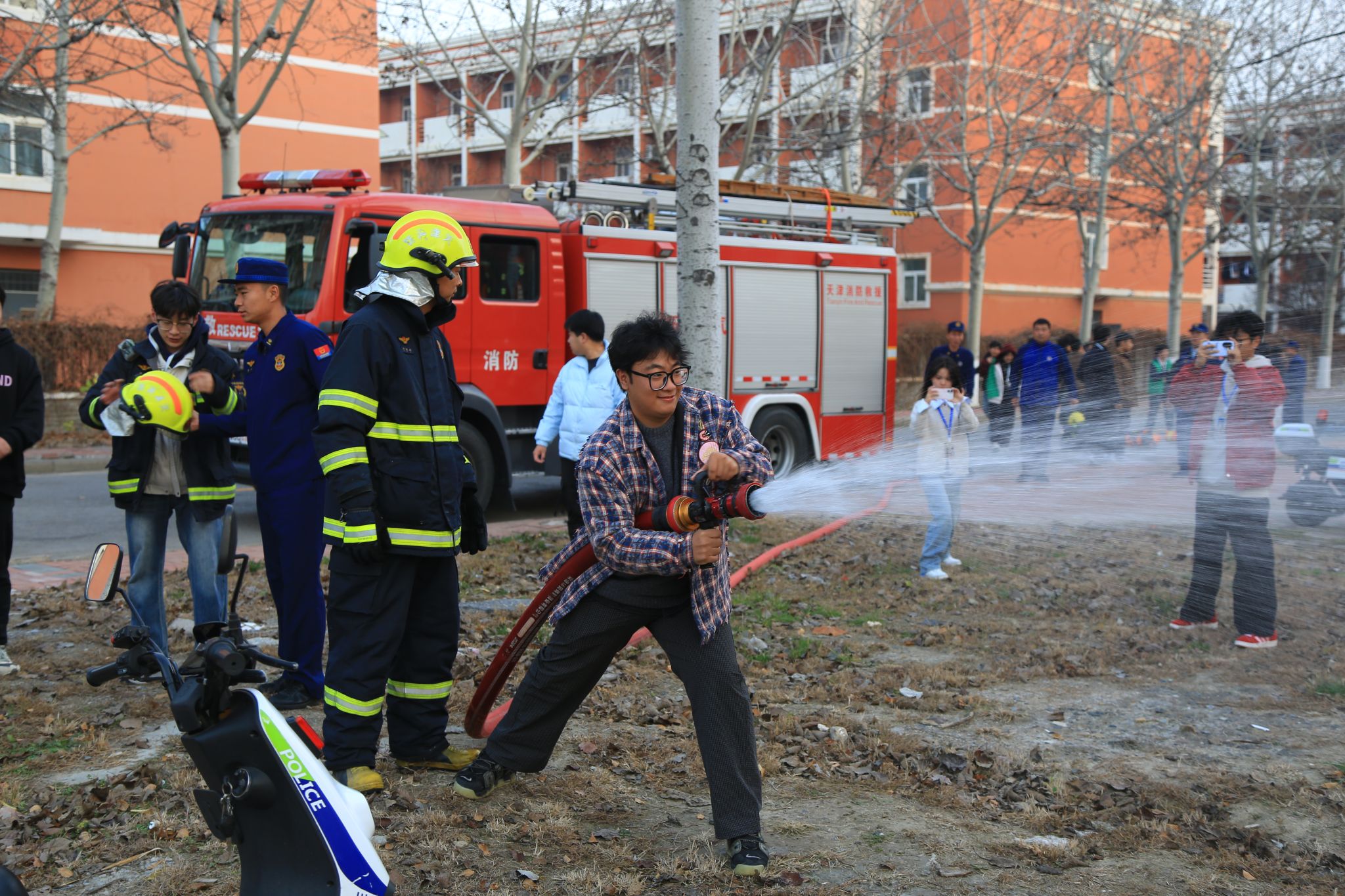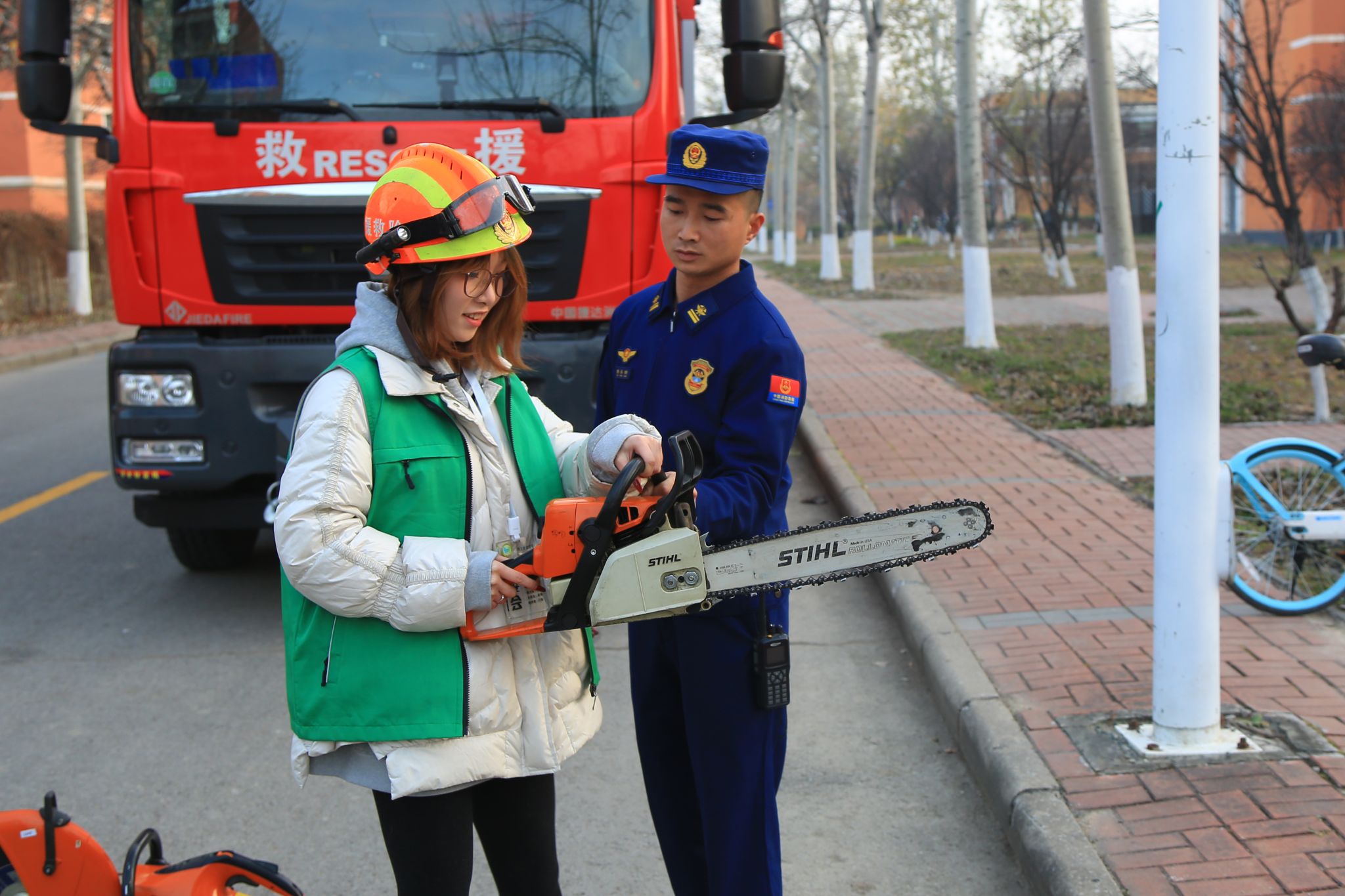 活动现场,京津新城消防站指战员和学院保卫处老师还为同学们带来了常见灭火救援器材使用方法讲解和展示,并指导同学们开展灭火实操演练。同学们踊跃报名,亲身体验穿着、使用消防救援装备,聆听消防指战员讲解火场逃生自护自救技能。