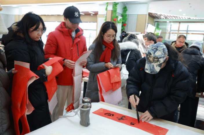 活动现场红纸铺展、墨香萦绕。书法家们凝神挥毫,笔走龙蛇,一幅幅寓意吉祥的春联、一张张气韵生动的“福”字在他们手中流转而生。师生们簇拥在案前,静观妙笔生花,感受汉字之美、笔墨之韵,并欣然领取这份兼具传统意蕴与时代祝福的“文化年礼”。
