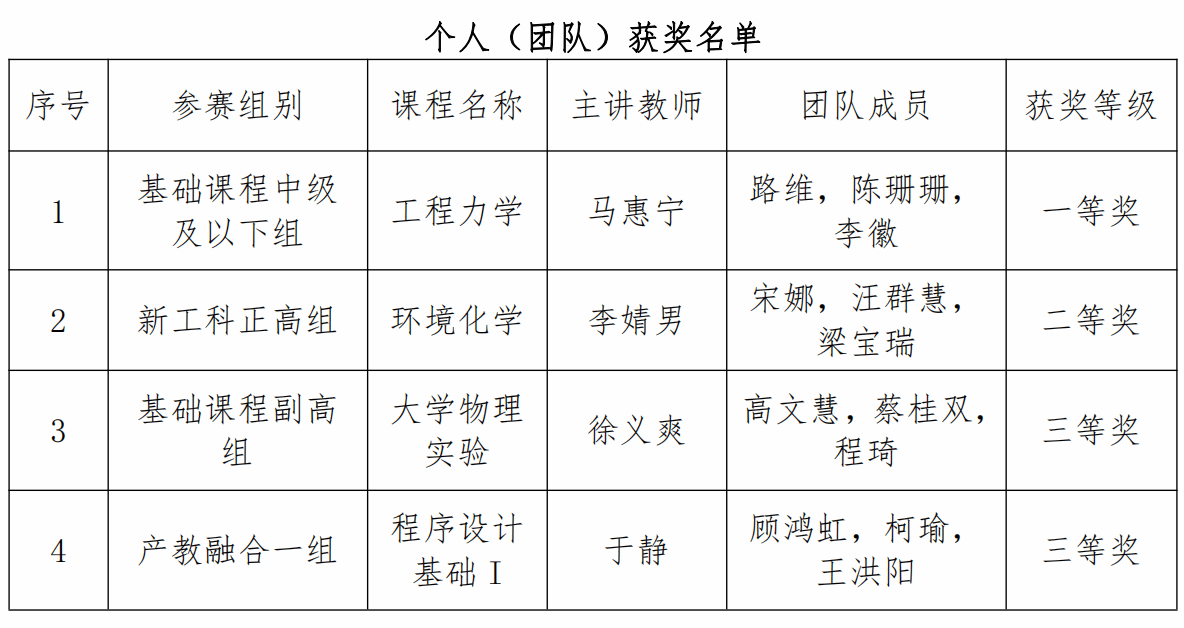 本次比赛,天津市共评选出一等奖 24名、二等奖 56 名、三等奖 72 名,我院在获奖等级和获奖数量上均取得新突破,共获一等奖1名、二等奖1名、三等奖2名,在同类高校中名列前茅。其中:基础部教师马惠宁领衔的《工程力学》课程团队荣获“基础课程中级及以下组”一等奖;材料与环境学院教师李婧男领衔的《环境化学》课程团队荣获“新工科正高组”二等奖;实验室管理中心教师徐义爽领衔的《大学物理实验》课程团队荣获“基础课程副高组”三等奖;信息工程学院教师于静领衔的《程序设计基础I》荣获“产教融合一组”三等奖。