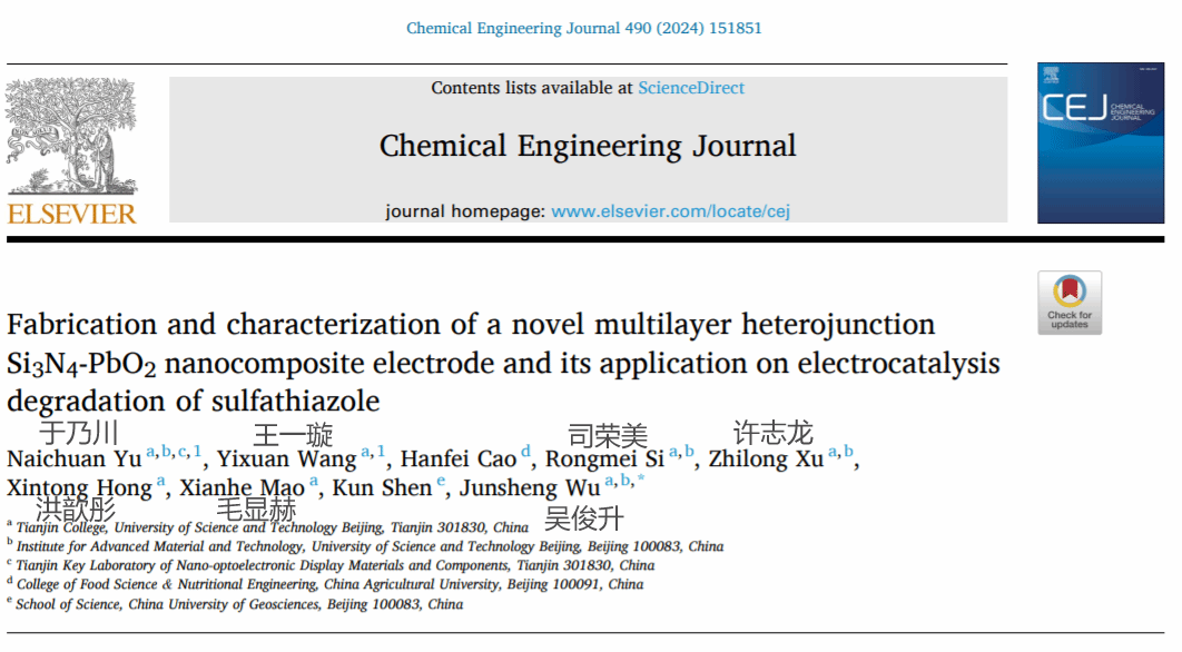 近日,我校材料与环境学院科研成果“Fabrication and characterization of a novel multilayer heterojunction Si3N4-PbO2 nanocomposite electrode and its application on electrocatalysis degradation of sulfathiazole(新型多层异质结结构Si3N4-PbO2电极的制备、表征及其电催化降解磺胺噻唑的应用)”在化工材料领域国际顶级期刊Chemical Engineering Journal(中科院一区期刊,影响因子15.1)上发表。材料系于乃川老师为论文第一作者,作者中还包括两名参与项目的本科生(洪歆彤、毛显赫)。该论文是在问鼎国际