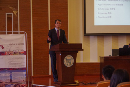 下午五点在我院理工馆报告厅,杰夫校长举办了“中美文化交流”讲座,给与会同学生介绍了美国阿尔玛文理学院相关情况、美国的教育体系以及如何适应美国的学习环境。