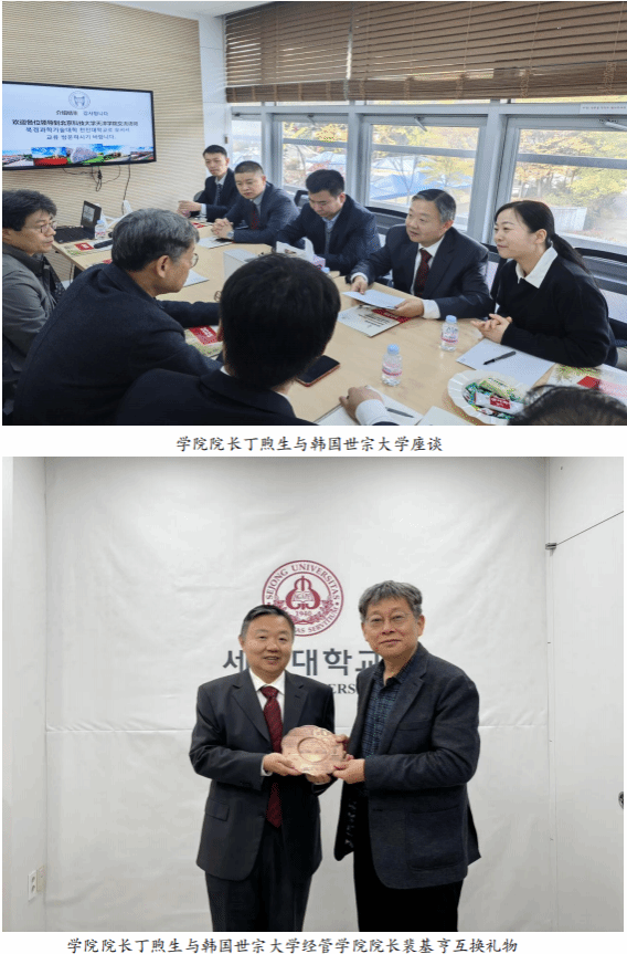 11月5日,丁煦生院长一行对韩国世宗大学进行走访。在交流座谈会上,韩国世宗大学经管学院院长裴基亨详细介绍了相关专业硕士及博士生项目、院校间跨国课题的申请及学术合作等,丁煦生院长介绍了学院基本情况,并强调双方要结合专业特色,进一步加强交流合作。双方就推动国际化人才培养交换了意见。