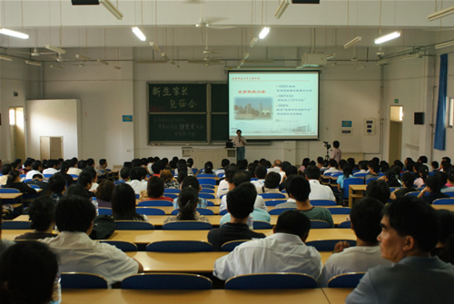 9月20日下午,在九教108室召开了新生家长见面会,我院常务副院长郭景文教授向08级新生家长介绍学院情况并回答问题。新生家长热情高涨,能容纳350余人的教室座无虚席。
