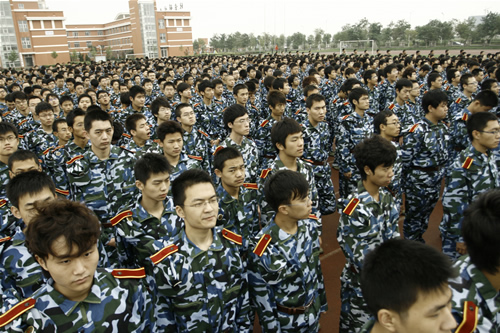 2009全体新生身着崭新的军装,英姿飒爽的列队在体育场。伴随艺术团管乐团现场演奏的国歌,国旗班将国旗缓缓升起,开学典礼正式开始。