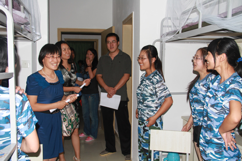 9月3日晚,院长郭景文、党委书记王斌、副院长曹连东、财务总监王合军、党委副书记盛佳伟在相关职能部门负责人的陪同下走访了新生宿舍,了解他们入学以来的生活、学习情况。