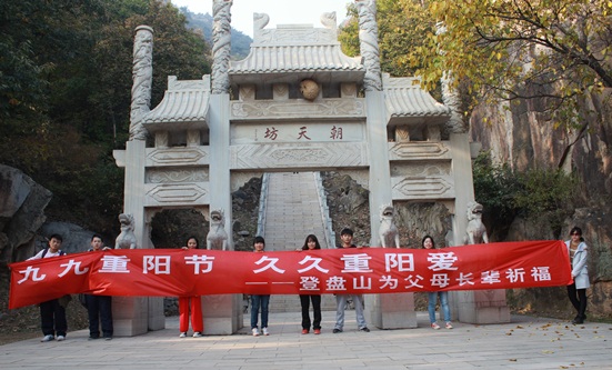 10月20日上午,孝心社一行20名同学在宣传部副部长张莉老师和孝心社秘书长田勇老师的带领下,从学院出发前往盘山。刚一下车,同学们纷纷感叹有“京东第一山”美誉的盘山其独有的壮丽巍峨。待田勇老师交代本次活动的安全注意事项后,大家便怀着对父母长辈的感恩之情,个个奋勇争先,直奔盘山山顶为长辈祈福。在登山过程中,同学们充分发扬了互相帮助,团结合作精神,并在盘山的南天门前拉起了横幅合影留念,共同祝愿天下为子女辛苦操劳的父母长辈健康长寿。