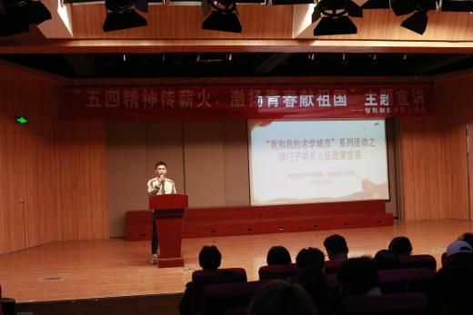 学院武装部刘武辉老师结合自身参军入伍经历,详细解读了2023年在津征兵入伍优待政策,勉励广大同学积极响应祖国号召、踊跃参军入伍,用参军报国的实际行动诠释对祖国的忠诚,将热血挥洒在实现强军梦的伟大实践之中。
