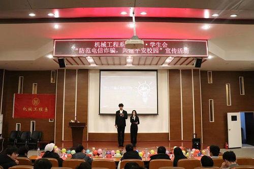 为维护我们安静的学习环境,提高防范意识,使同学们在平时的生活中远离诈骗分子,圆满的完成自己的学业,机械工程系于12月1日下午5点在理工图书馆学术报告厅举办了以“防范电信诈骗,共建平安校园”的情景剧活动。此次活动到场的有机械工程系分团委书记张军老师、材料系19级辅导员韩子玉老师以及机械系分团委、学生会主席团和部长团成员。