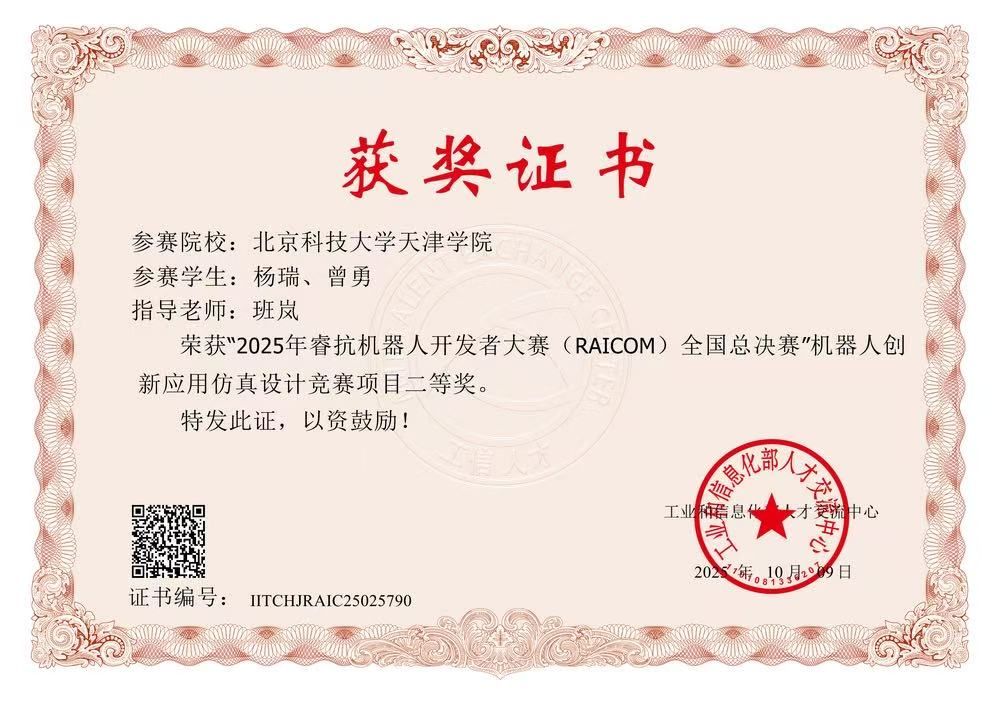 近日,由工业和信息化部人才交流中心主办的2025睿抗机器人开发者大赛 (RAICOM) 全国总决赛落下帷幕,我院智能制造学院机械工程(机器人应用) 专业学生杨瑞和曾勇在班岚老师的指导下,于“机器人创新应用仿真设计”赛项中荣获全国总决赛二等奖和天津市赛区二等奖。