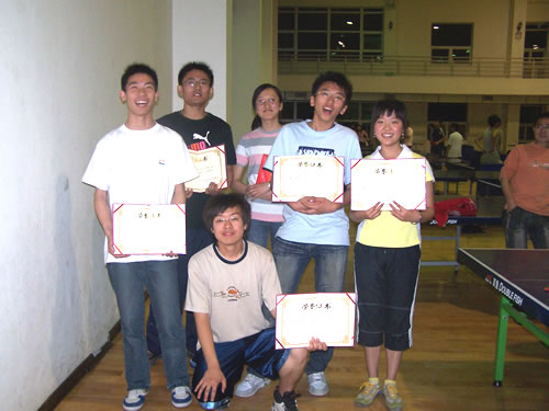 晚7:00,决赛开始。决战双方为05级会计和06级信息代表队,赛制分为男单、男双、女单、女双、混双五场。男单决赛中,比赛刚一开始,两名选手便显示出了不凡的实力,发球、抢功等技术运用得十分自如,体现了较高的技术水平,05级会计选手率先拿下一局。第二局,06级信息选手后发制人,发挥自身优势,减少无谓失误,有效抑制了对手的进攻,扳回一局。接下来的比赛中,两人又各赢一局。在决胜局的较量中,05级会计队选手沉着应战,对球的处理十分果断,每球必争,最终以3:2拿下比赛。之后的男双、女单、女双和混双的比赛也都十分精彩,最终,06级信息代表队凭借3:1的总比分获胜,获得本次乒乓球赛冠军,05级会计代表队荣获亚军,06级物流获得季军。