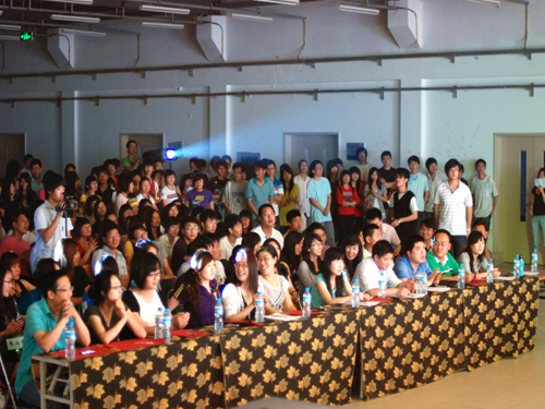 决赛当晚气氛热烈,吸引了众多观众到场观看并为所支持的表演队加油鼓劲。开场先播放了五分钟的视频短片,短片展现了各表演队伍以及工作人员前期的辛勤准备以及和睦团结的氛围。决赛第一组是由法律系杨天宇、武铮表演的《西征梦》,经典的郭德纲段子由两位参赛选手表现的惟妙惟肖,台下更是笑声不断。接下来上场的是经济系崔慧敏、张倩、魏长宁表演的《小张说事》,突出的创意和生动的表演让观众流连忘返,其中由魏长宁同学表演的小沈阳更是魅力十足神气活现。