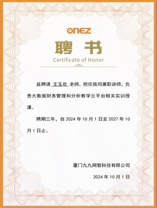 在培训过程中,管理学院十分注重对青年教师的培养,着力为青年教师深度拓展各种培训平台,不断给予系统培训机会,帮助青年教师专业成长,教师们在培训期间也收获颇丰。今年暑假管理学院任洁老师和王玉欢老师依托财务报表一流课程建设,参加了厦门九九网智科技有限公司组织的大数据财务管理和分析教学云平台相关实训,并通过考核,获得培训证书。随着数字化技术和智能化技术的快速发展,相关技术已经广泛运用于会计信息处理、财务报告编制、审计和税务等方面,此次培训结合大数据分析技术,对大规模财务数据进行数据清洗、转换和详细分析,最终实现数据可视化功能,能够满足我院专业课程和教师技能发展需求,良好提升教师数字化技能。由于我院王玉欢老师在此培训中表现突出,并在最终考核时取得优异成绩,九九网智科技有限公司特地向该教师发出邀请,担任兼职讲师,最终王玉欢老师获得兼职讲师聘书。