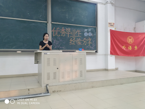 2019年6月16日18:30,外语系在9教109召开了优秀毕业生经验分享会。分享会邀请我院优秀毕业生、英语1501班陈洁琼同学主讲。我系全体在校同学参加本次分享会,分享会由外语系分团委书记李萌主持。外语系党总支书记张莉、副书记张添善出席此次分享会。