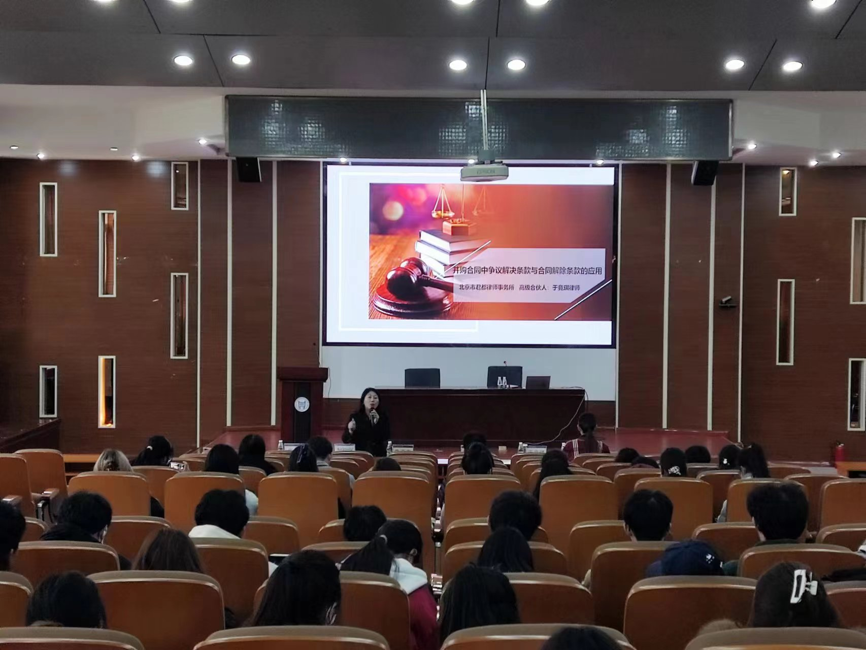聘任仪式结束后,于竞琪教授为师生们带来题为“并购合同中争议解决条款与合同解除条款的应用”的实务专题讲座。讲座由法律系主任朱京安教授主持,王超副教授担任与谈嘉宾,法律系师生共同聆听了这场讲座。