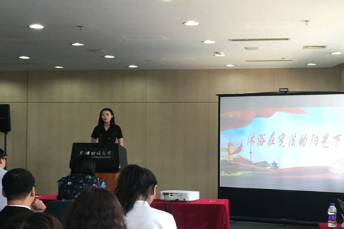 为深入贯彻落实党的十九届二中全会精神,法律系师生深入开展尊崇宪法、学习宪法、遵守宪法、维护宪法、运用宪法的宣传教育活动,大力弘扬宪法精神,大力弘扬社会主义法治精神,不断增强师生宪法意识。法律系5月初起,积极准备2018年天津市学生“学宪法讲宪法”主题演讲比赛。通过系内选拔,最终确立参赛选手为法律系法学1601班学生李雨萌,于2018年5月31日在天津财经大学参加比赛。
