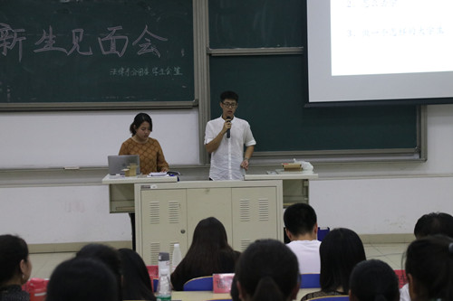 法律系分团委、学生会主办的2018级新生见面大会在9教108隆重展开。法律系分团委书记赵慧敏老师、2016级辅导员陈旭老师、新生军训导员方洁老师以及法律系学生会主席团成员出席了本次大会。