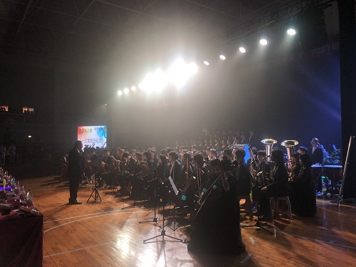 学生艺术团管弦乐团演奏《一枝茉莉送给党》,乐曲像潮水般奔腾而出,曼妙的旋律表达了对党的浓厚感情。