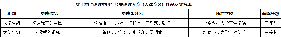 近日,第七届中华经典诵写讲大赛“诵读中国”经典诵读大赛获奖名单公布,我院参赛作品在本届竞赛中分别荣获天津赛区教师组二等奖1项,大学生组三等奖2项。