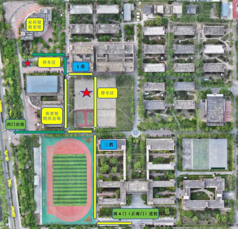 若自驾返校,为方便车辆有序进出,自驾者统一从南三门(正南门)进校,西门出校,将车辆停放在体育馆东侧参会车辆停车区。