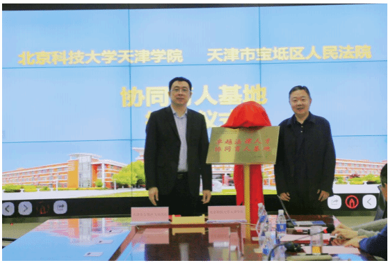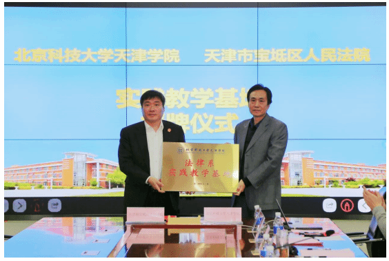 法律系代表朱京安主任向区法院代表董海明副院长授牌,法律系在宝坻区法院建立“问鼎国际