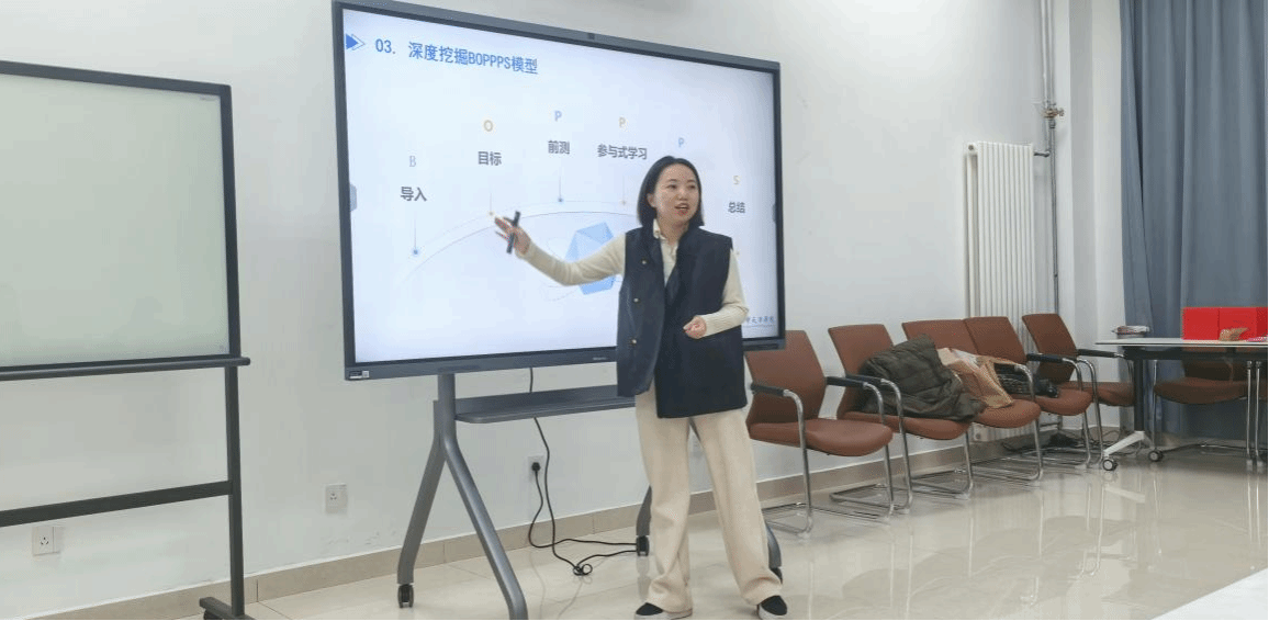接下来,智能制造学院的韩红蕾老师对BOPPPS教学模型进行了全面而深入的剖析。她指出,运用BOPPPS模型的核心在于激发学生的学习兴趣,提升其参与度,确保学生真正学会、学懂。韩老师结合自身丰富的教学实践,生动阐述了如何在课堂的每一个环节精准施策,以及教师应如何不断学习新的教学理念、教学模式和教学评价方法,将其巧妙融入课堂,推动课堂的持续改革与创新。