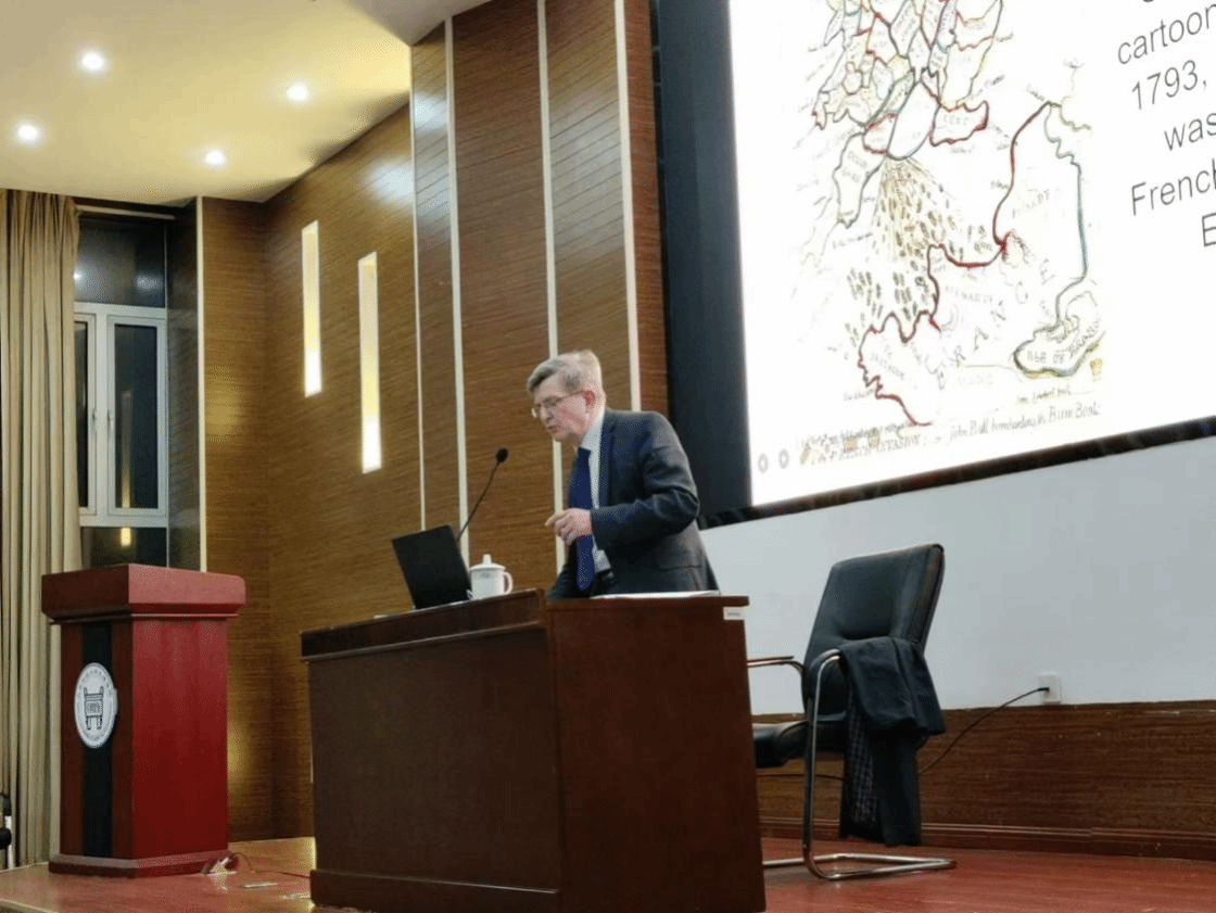 Buck教授从中世纪后期英国民族意识的形成开始讲起,梳理了英国十几个世纪的历史文化精华。Buck教授生动、详细的讲座,加强了在场师生对英国历史和文化发展进程的进一步了解:英国在中世纪的时候是基督教欧洲区域的一部分;16世纪的宗教改革将英格兰从欧洲实体中分离出来,在受到文艺复兴影响的同时,英国独特发展的身份得以塑造,使其与西班牙的征服和反征服的过程中幸存下来;17世纪的宗教冲突导致了英国两党制和辩论文化的建立,促进了英国科学、技术以及艺术和思想领域的蓬勃发展,进而使得英国成为了一个在国际领域具有影响的大国,开启了欧洲工业革命的序幕,而工业革命反过来又推动了英国乃至世界的社会科学发展。由历史演化到预测当今世界的发展,Buck教授深入探讨了20世纪中叶英国大国地位的逐渐丧失和英国社会构成变化的原因,为听众展示出英国社会发展进程中的一帧帧画面。讲座的问答互动环节气氛热烈,学生踊跃发言提问,积极发表自己的见解并就自己的疑惑向教授请教,Buck教授对提出的问题做了耐心地做了一一解答。