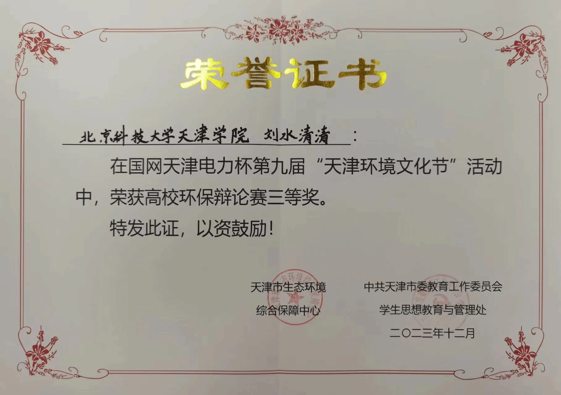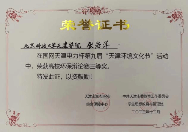 12月9日,由天津市生态环境局、天津市教育委员会及天津市文明办、津云新媒体集团、国网天津电力公司共同发起的国网天津电力杯高校环保辩论赛决赛暨第九届“天津环境文化节”闭幕式落下帷幕。由我院校团委副书记黄云汉老师指导的学院辩论队与来自全市的40所高校的大学生辩论队,经历初赛、复赛、半决赛及总决赛的激烈角逐,我院辩论队与南开大学、天津工业大学等高校荣获“国网天津电力杯”第九届天津文化节高校环保辩论赛三等奖。