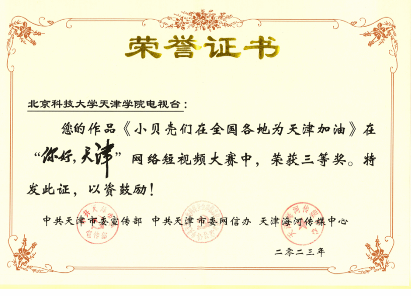 近期,由天津市委宣传部、天津市委网信办、天津海河传媒中心联合举办的“你好,天津”网络短视频大赛获奖结果揭晓。我院电视台《在夏天遇见的》、《小贝壳们在全国各地为天津加油》、《结业典礼正版来啦》3部作品经过激烈的角逐和比拼,突出重围,在本届“你好,天津”短视频年度总决赛荣获三等奖佳绩!
