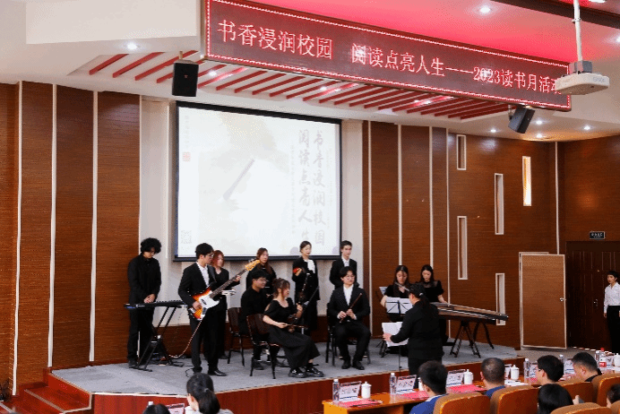 此次读书节晚会在未亭民乐团带来的《市集》中拉开帷幕,古筝、二胡、笛子、贝斯、键盘以及打击乐等中西乐器合奏,体现了校园文化的丰富多彩。