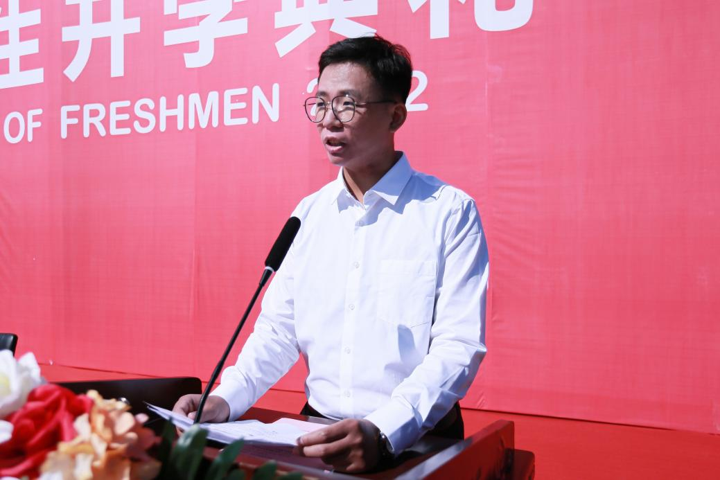 院长、党委书记丁煦生在开学典礼上致辞。他代表学院全体师生员工向2022级新生表示衷心的祝贺和热烈的欢迎。他寄语新同学们要涵养家国情怀,筑牢立身之本、成才之基;要掌握大学学习之道,潜心向学、努力成才;要养成良好的品行,遵纪守法、自律自强。也希望同学们立大志、明大德、成大才、担大任,以饱满的热情和昂扬的姿态迎接党的二十大胜利召开,弘扬和践行“明德励学、效实致新”的校训精神,驾青春之舟,逐梦扬帆,度过最美好的“贝壳田园”时光!