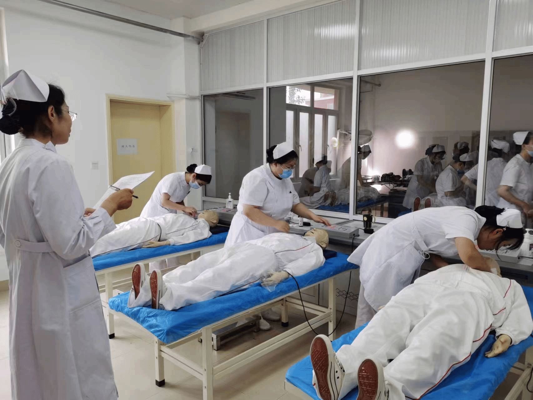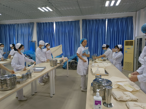 护理系杨新月主任亲自承担专题讲座,全体教师在杨新月主任的领导与影响下,加班加点、有条不紊地推进学生在校的教学计划,提前将护理操作的视频、操作流程以及评分标准发给学生,要求做好预习,同时按照以往要求,严格检查学生仪容仪表和着装,以护士行为准则规范学生行为,提倡理论与示教相结合,重视示范操作、强化练习和考核,将实训室作为病房,模拟人为病人,以分组练习和个别指导的方式,保证操作的准确性。学生们的学习热情高涨,大家已经忘记了天气的炎热,将全身心投入到每一堂课,以便更好地掌握理论和操作技能。