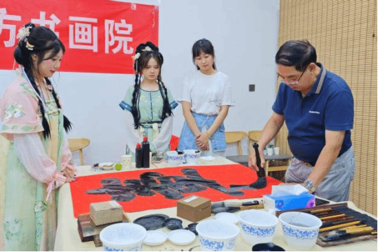传统文化体验馆温情上演。为深入推进新时代美育工作,传承中华优秀传统文化,2025年7月1日下午2:00天津市艺术学会知方书画院的艺术家们莅临我院,以品茶论道、挥毫泼墨的形式,为师生们带来了一场浸润心灵的文化体验,同时提升学生的艺术素养。