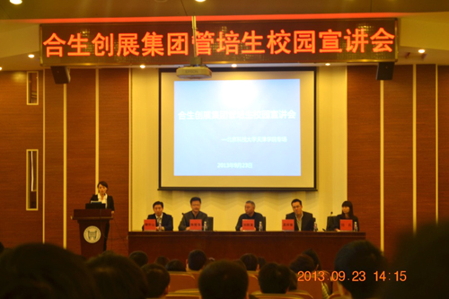 9月23日下午14:00,合生创展集团在我校举办了合生创展集团管培生校园宣讲会,出席宣讲会的有合生创展集团陈楚强、闫兵、滕怀山,土木工程系主任刘胜富,土木工程系党总支书记孟祥瑜。 讲座上,合...
