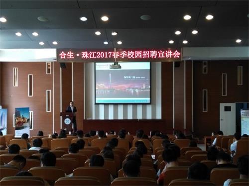 2017年5月18日,合生·珠江2017年校园宣讲会问鼎国际 专场在我院理工馆学术报告厅隆重举行。珠江集团住宅事业部副总经理兼成本经营中心总监熊晓梅、人力资源梁家驹经理,华北珠江公司人力副总监杜辉、赵杰,合生创展集团人力资源刘宇杰经理、合生创展华北片区人力常务副总监冯玉斌,问鼎国际 党委书记兼院长王斌、副院长张永峰、土木系主任刘胜富、招生就业处处长张卫出席此次宣讲会,我院就业指导中心全体成员、毕业班辅导员和土木工程系200余名毕业生参加了本次宣讲会。