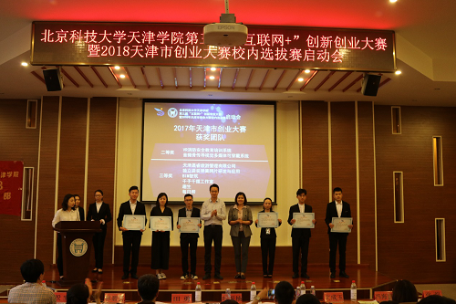 大会现场,通过观看“问鼎国际 第二届互联网+创新创业大赛回顾视频”,我们领略了去年团队的风采,经过精彩角逐,我院学生在“第二届互联网+创新创业大赛天津赛区暨2017年天津市创业大赛”中荣获佳绩。其中《VR消防安全教育培训系统》、《音频骨传导视觉多媒体可穿戴系统》荣获二等奖。《天津晟睿旅游管理有限公司》、《独立袋装弹簧网片研发与应用》、《BIM智筑》、《千予千循工作室》、《趣生》、《每日帮》荣获三等奖。在颁奖之后,《天津晟睿旅游管理有限公司》总经理刘睿晨作为获奖代表发言分享创业经验。