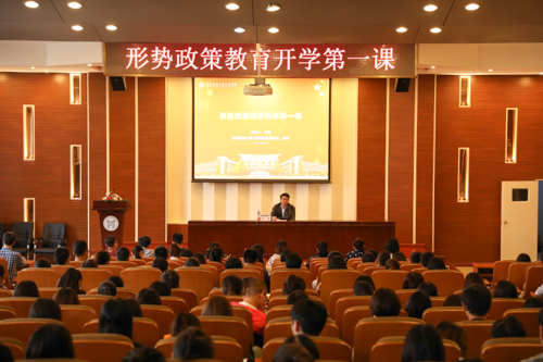 为深入学习贯彻习近平总书记系列重要讲话精神和党中央治国理政新理念新思想新战略,全面贯彻落实习近平总书记7.26重要讲话精神,迎接党的十九大胜利召开,9月27日,学院党委书记、院长王斌为学生讲授形势政策教育开学第一课,200余名学生党员和各党支部书记聆听了讲课。