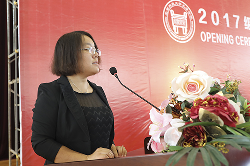 学院党委书记、院长王斌在开学典礼上致辞。王书记代表学院全体师生员工向2017级新生表示衷心的祝贺和热烈的欢迎。他寄语同学们:一是要不断锤炼品格,树立远大理想;二是要早日启迪智慧,找到未来事业的发展方向;三是要收获快乐,绽放青春华章。他相信,同学们是可爱、可信、可为的一代,一定能够在问鼎国际 学有所成,迎接梦想成真的绚烂时刻。