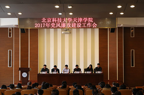 党委书记王斌传达了中纪委七次全会精神和习近平总书记重要讲话精神、北京科技大学2017年党风廉政建设工作会议精神、天津市教育系统2017年党风廉政建设工作会议和天津市教育系统不作为不担当问题专项治理推动会有关精神,并对学院党风廉政建设进行部署。他强调学院将严格落实天津市教育两委和北京科技大学党委有关部署的要求,扎扎实实开展党风廉政建设和反腐败工作,认真做好专项治理工作,为营造良好的校园政治生态和育人环境做出更大的贡献。