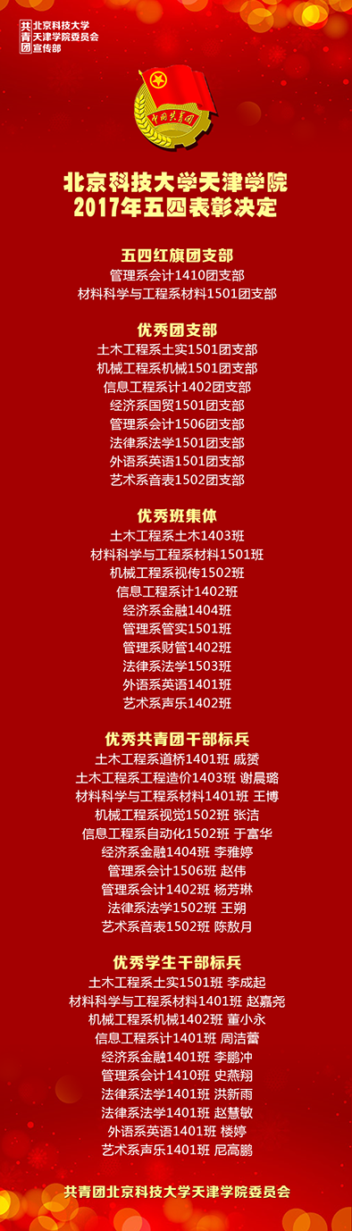 大会伊始,全体师生起立,奏唱国歌,随后团委书记殷实宣读了《2017年五四表彰决定》。管理系会计1410团支部、材料系材料1501团支部获得五四红旗团支部荣誉称号,土木系土木1501团支部等8个团支部获得优秀团支部荣誉称号,材料系材料1501班等10个班获得优秀班集体荣誉称号,谢晨璐、王博等10名同学获得优秀共青团干部标兵荣誉称号;董小永、周洁蕾等10名同学获得优秀学生干部标兵荣誉称号。