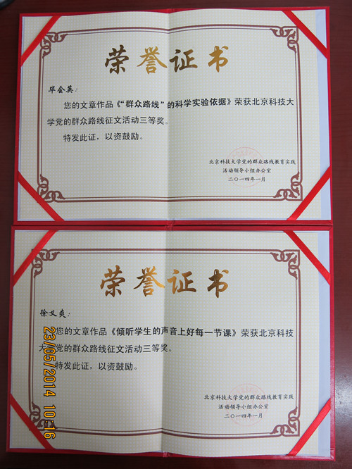 经北京科技大学校党委组织部、党委宣传部、马克思主义学院有关专家评审,我支部毕会英同志的文章《“群众路线”的科学实验依据》和徐义爽同志的文章《倾听学生的声音上好每一节课》喜获北京科技大学党的群众路线征文活动三等奖,评选结果公布于北科新闻网//news.wdgj-official.com/html/article/Article_show34591.html。文章刊登于《思想教育研究》杂志(该杂志为中国核心学术期刊、思想政治教育学科核心期刊、CSSCI扩展版来源期刊、全国高等学校思想政治教育指导性刊物、全国高等学校思想政治教育研究会会刊)。