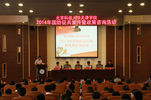 为贯彻落实《兵役法》、《征兵工作条例》、国防部征兵办公室《关于扎实做好2014年征兵准备工作的通知》及天津市相关政策文件要求,6月5日下午3:30,我院2014年国防征兵宣传暨政策咨询活动在学术报告厅举行。宝坻区委常委、区武装部政委陈高龙、区武装部部长温华战、副部长徐进、我院党委书记王斌、党委副书记白亮、学生处处长叶振楠出席活动。活动由我院武装部副部长罗富臣主持。