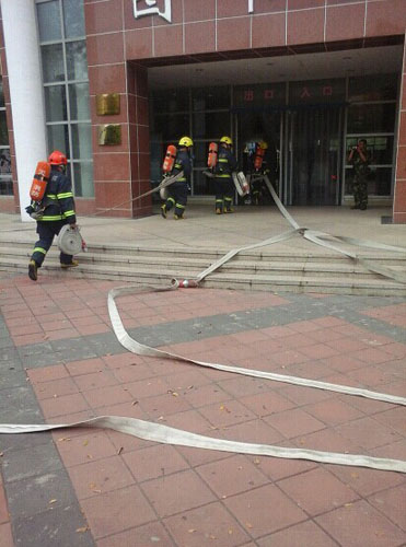 4、到达火场,展开灭火。消防官兵结合我院处突小分队人员对着火部位分别从室外及室内展开多路水枪阵地进行灭火。